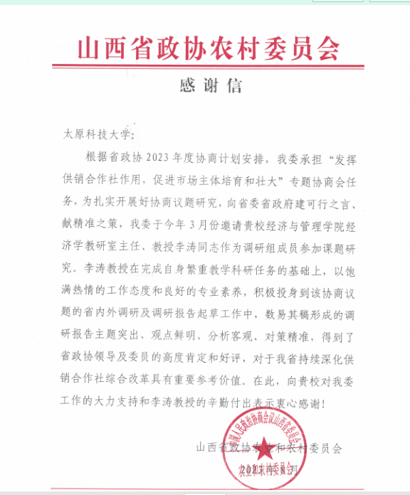 近日,山西省政协农业和农村委员会向我校发来感谢信,对我校和民盟新葡的京集团350vip8888委员会副主委、新葡的京集团350vip8888教师李涛完成该委承担的专题协商会任务做出的突出贡献表示感谢。