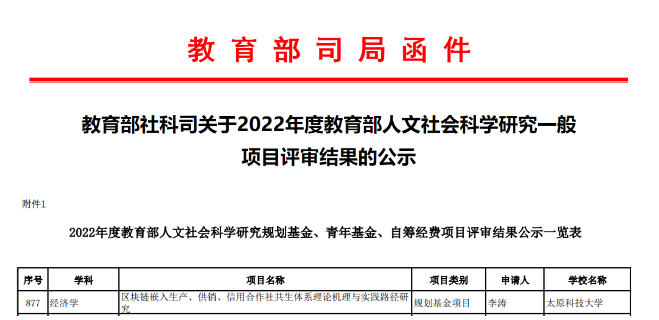 7月29日,教育部社科司公布了2022年度教育部人文社会科学研究一般项目评审结果,新葡的京官网李涛副教授主持的课题《区块链嵌入生产、供销、信用合作社共生体系理论机理与实践路径研究》成功立项规划基金项目。经济学学科规划基金项目立项总数全国仅96项。