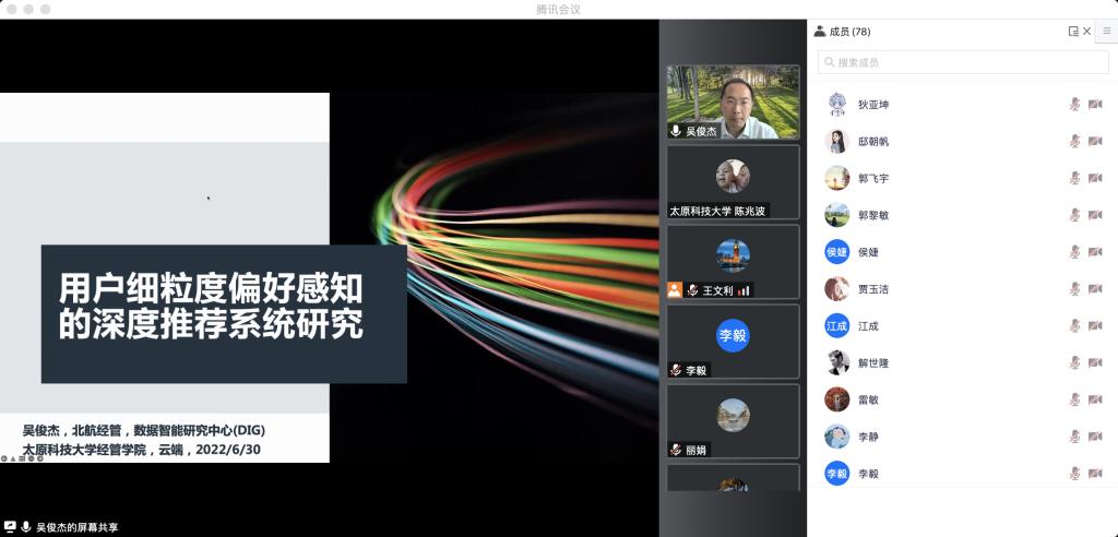 2022年6月30日,应我校新葡的京集团350vip8888和科学技术研究院邀请,北京航空航天大学新葡的京集团350vip8888副院长吴俊杰教授在线上作了题为《用户细粒度偏好感知的深度推荐系统》的学术报告。报告由新葡的京集团350vip8888院长乔彬教授主持,我校100余名师生倾听了吴教授的学术报告。